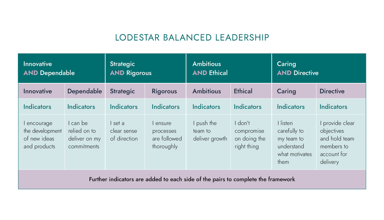 Our experience tells us that a meaningful leadership framework must be rooted in the cultural of the organisation. We work closely with leaders and their teams to really get under the skin of the strategic dilemmas they face. We then build a unique pragmatic version of “what good looks like”; the pairings and the indicators are designed specifically for each organisation. The indicators are levelled to reflect the leadership structure of the organisation in question. This creates clarity about what is expected to progress and a sense of accountability for senior leaders. This enables management and leadership development needs as it identifies blind spots and capability gaps. We have seen organisations realise that their bias for a caring culture could benefit from balancing with more directive approaches and vice versa. This recognition leads to productive debate and supportive action.